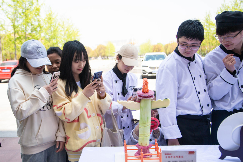 活动过程中,酒店专业师生负责展台设计和布置,面点、烹饪等师生按照党史发展历程摆放自己作品。本次活动共展出14件作品,作品栩栩如生,生动逼真的呈现了作品原貌,吸引了众多师生的驻足、留影。参观师生看到作品后惊叹于师生技术的高超和魅力。果酱画作品《开天辟地第一桨》,采用简笔画加上色的形式,展现了红船,表达红船精神的一种传承;面塑作品《红军远征威名扬》,生动形象的展示了红军万里长征路线和胜利场面;冷拼作品《5G微波联姻强》,展现了中国的科技及发展等。