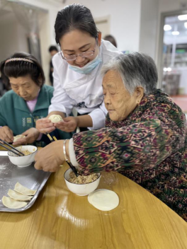 一大早,团队成员将原料运送到养老院的餐厅,开始一系列的准备工作:从布置场地到清洗原料,再到切配、调味、制馅……一切准备就绪后,老人们也陆续进入餐厅。看着老人脸上洋溢的笑容,团队成员心中都泛起暖意。在安排老人围坐桌子后,大家开始一起制作水饺。过程中,团队成员及时地给予老人帮助和指导。在消除陌生感之后,老人们谈起来到这里的缘由,或是因为儿女工作忙,或自己有慢性病,最后天南地北地聚在这里……看到老人脸上露出落寞的神情,成员们及时上前安抚,有的开导,有的逗趣,还有的则默默环抱住老人的肩膀。在大家的努力下,老人们变得开朗许多,又聊起各种生平趣事,使得整个活动过程温暖又有趣。