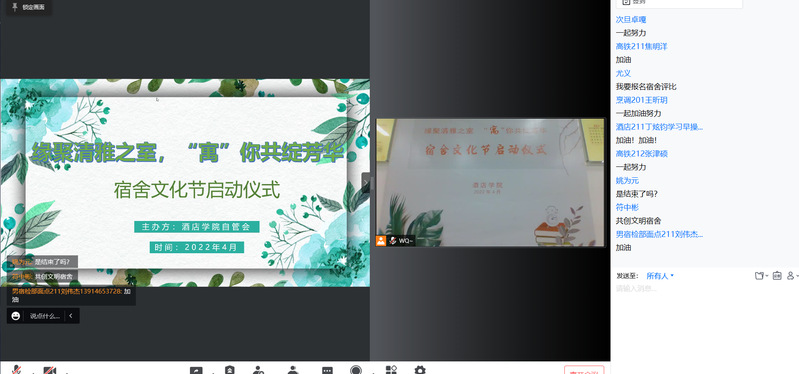 应疫情防控要求,本次活动采用线上直播形式开展。活动开始前通过视频向大家展示以往宿舍文化节作品,激励同学们向优秀宿舍看齐。随后仲淑秋书记致辞发言,她指出,现阶段宿舍是员工们交流最为频繁的场所,宿舍建设尤为重要。本次宿舍文化节将通过开展丰富多彩的文化活动给同学们一个施展才华、展示自我的舞台,宣布新学期宿舍文化节正式启动并预祝取得成功。随后员工宿舍代表进行文明宿舍建设的经验分享,号召大家不负春光,努力建设属于自己的“文明宿舍”。最后活动负责人向大家讲解了本次宿舍文化节活动的各个项目以及各项要求,让大家对活动有更进一步的了解,鼓励大家积极报名、踊跃参加。