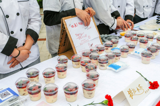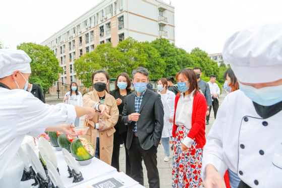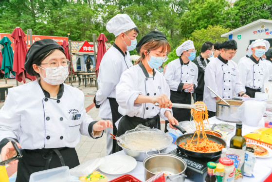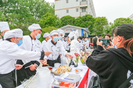 在各实训室,员工着装规范,操作娴熟,卫生把控严格,精心制作各式菜品,反映出员工扎实的烹饪基本功;在雕刻、冷拼、果酱画、中西特色细点、西餐热菜展示区,精心制作的作品和员工娴熟的技能表演吸引众多师生驻足观赏,合影留念,现场热火朝天,其乐融融。