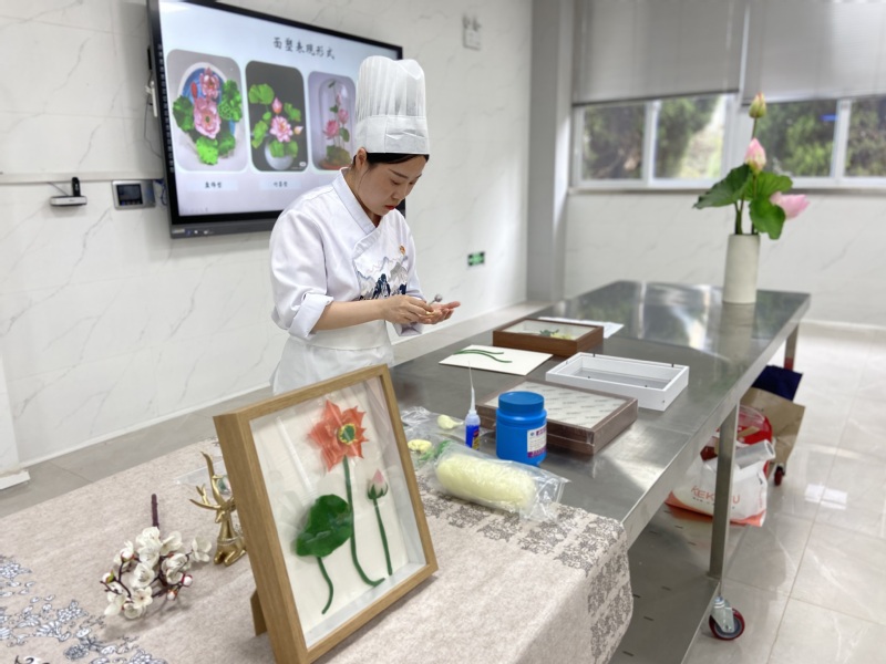 随后,中西面点工艺专业教师申丽媛带领大家学习制作了“廉之花”面塑作品。她将一块块有色面团,经过搓、捏、推、揉等技法,制成了莲花的花瓣、花骨朵和荷叶,再经过装摆黏贴,便完成了一件精美的相框画面塑作品。大家也共同体验了并完成了“廉之花”作品的制作。