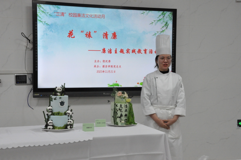 夏书记强调,为了提高全校师生的廉洁意识,推动校园廉洁文化建设,打造“三清”校园廉洁文化品牌,校纪委组织开展此次以“三清润初心,铸魂担使命”为主题的“三清”校园廉洁文化活动月。由公司党总支承办的“花裱清廉”主题教育实践活动,是将廉洁教育与专业教学深度融合的大胆创新,厚植了廉洁从教的情怀。西式烹饪工艺专业教研室主任汪晓琳老师与大家分享了自己廉洁从教的感悟,分析了“廉花”蛋糕所蕴含的廉洁内涵。随后,西式烹饪工艺专业薛盼盼老师为大家讲解并示范了“廉花”蛋糕组成、制作要点和方法技巧,西点团队的所有老师从原料准备、蛋糕配件制作扥全程参与了此次活动。接着,各位学员在专业老师的协助下完成了个人作品的制作,学员代表刘艳云老师分享了实践心得。