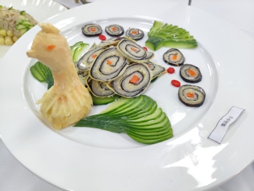 本次烹饪技能竞赛要求制作以“荷”为主要元素的热菜作品,原料不限,作品风味应富有参赛队所在地区的当地特色,评委则根据菜品的口味与质感、形态与色泽、工艺与数量、创意与实用以及营养与卫生等五个方面进行评分。通过各参赛选手精心设计的“创新菜”,反映出两岸学子独具匠心的创意与优良的职业素养,均得到了现场评委一致好评。经过激烈角逐,公司朱素敏、黄成、莫耀华、陆雨团队摘得一等奖。