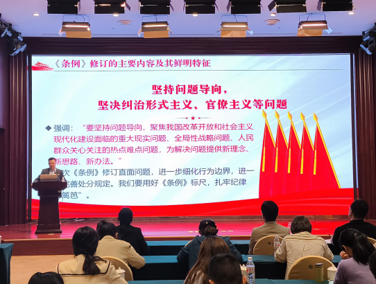 在警示教育馆,党员们跟随讲解员的解说,深入了解了近年来全市查处的严重违纪违法典型案例。“迷失的初心、放纵的权力、致命的陷阱、贪婪的群鼠、污染的生态”五大主题通过图片、文字、视频短片、实物展示等形式进一步警示警醒广大党员干部要远离纪律红线、守住法律底线。参观结束后,党员们集中观看了警示教育片,再次接受了思想和灵魂的洗礼。董道顺书记作党纪学习教育专题党课,从《条例》修订的主要内容、鲜明特征以及新修订的《条例》对于推动全面从严治党向纵深发展的重要意义几方面带领大家深入学习了新修订的《中国共产党纪律处分条例》