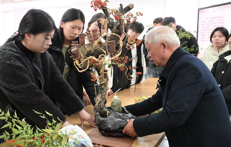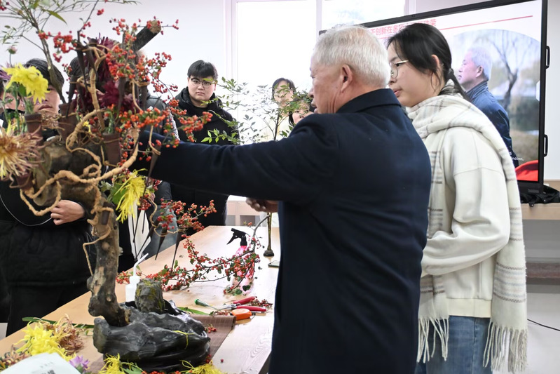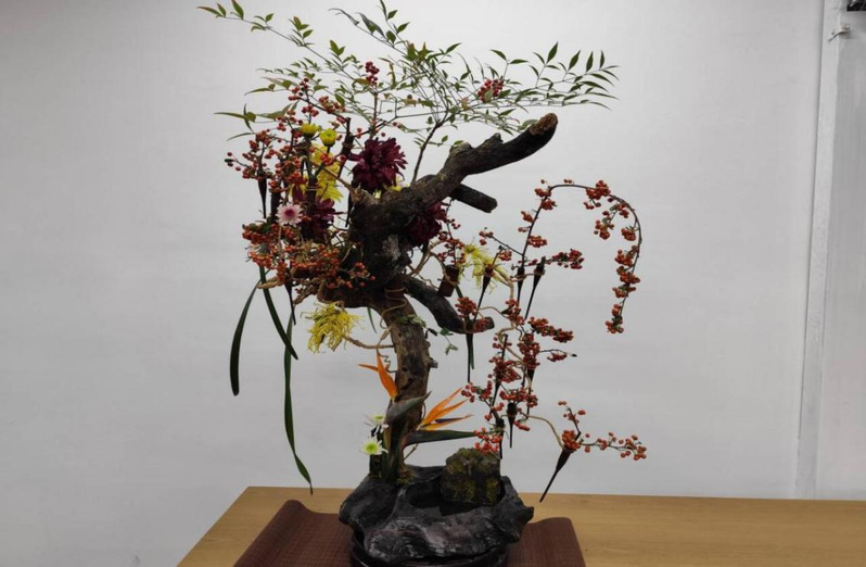 员工们在曾老师的指导下挑选花材、构思布局、修剪枝叶,让原本普通的花枝在指尖绽放出独特韵味。